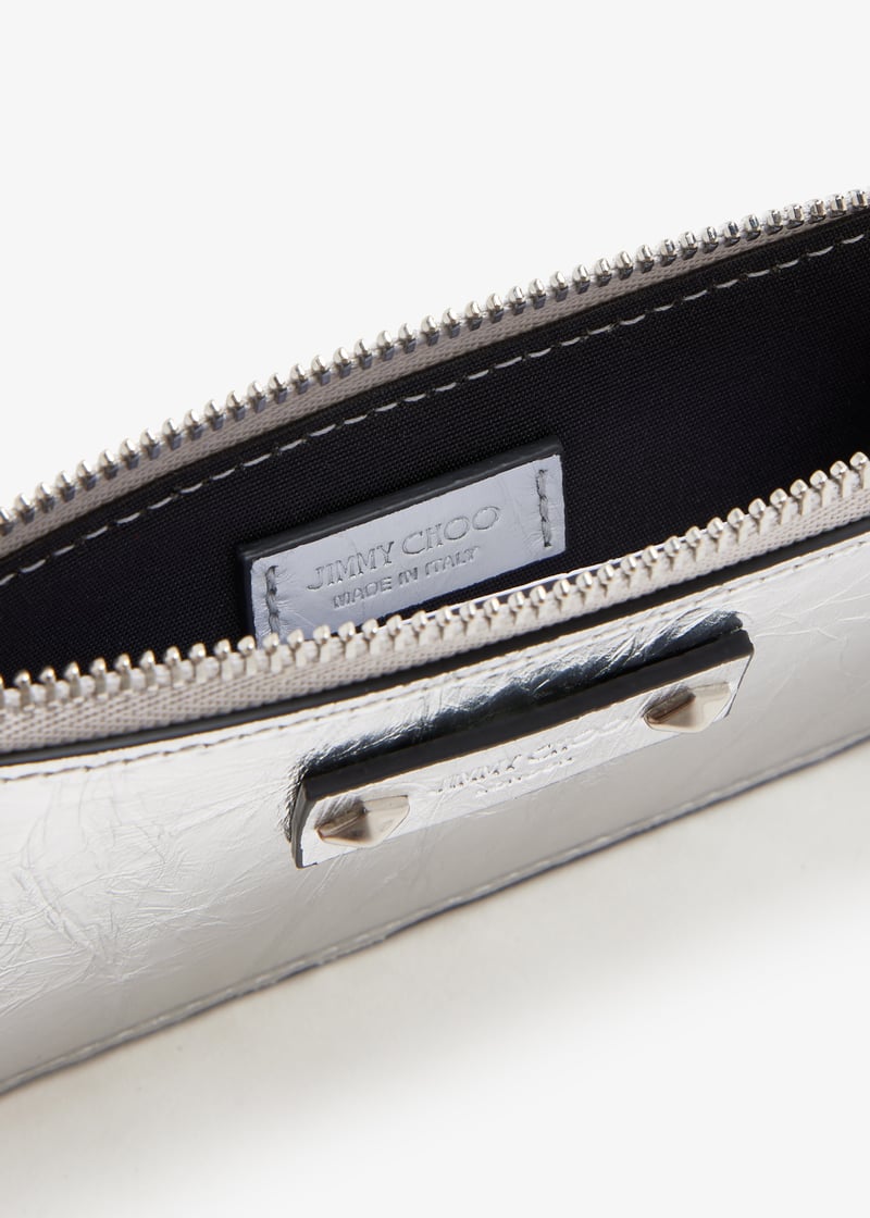 تتميز حافظة البطاقات لايس زي من جيمي تشو ببنية من الجلد المعدني اللامع والمزدان بتفاصيل "دايموند" ونقش شعار الدار. تحتوي على ست فتحات للبطاقات وجيب بسحّاب للعملات المعدنية، مما يجعلها مثالية لحفظ احتياجاتكِ الأساسية في متناول اليد.